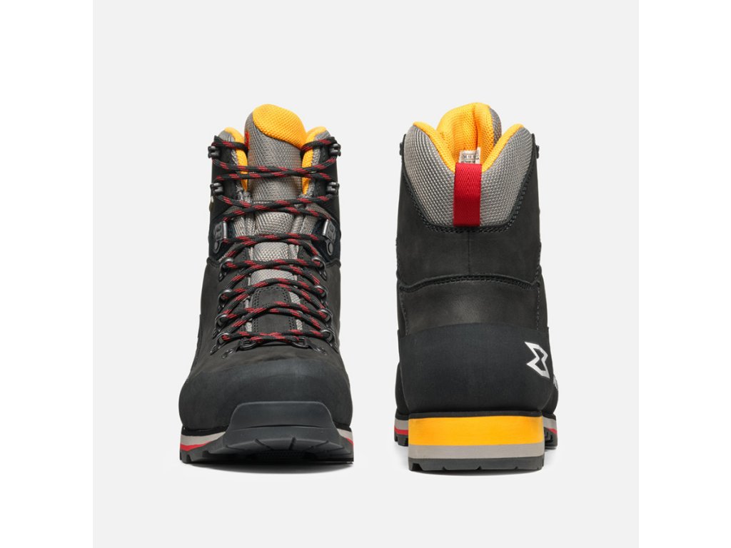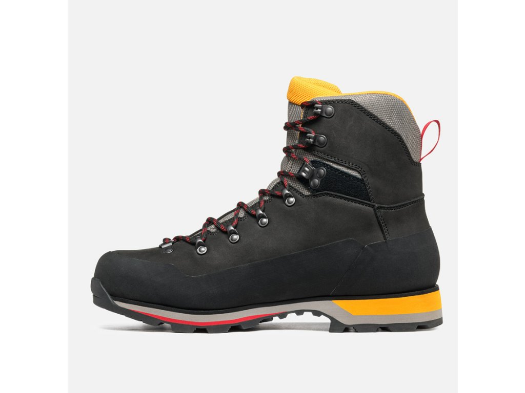 Model Nebraska II GTX stavia na tom, čo fungovalo, a pridáva to, čo v teréne cítiť hneď: lepšiu priľnavosť a istotu došľapu. Zvršok tvorí pravá nubuková hovädzia koža (~1,9 mm) – odolná, ale poddajná, s prirodzenou priedušnosťou a dlhou životnosťou. Membrána GORE-TEX spoľahlivo tesní proti zrážkam a mokrej tráve, no prepúšťa vlhkosť smerom von. Podrážka Vibram (Antrona / XS Trek EVO, Traction Lug) má agresívnejší dezén, ktorý lepšie „zakusne“ do mäkkých povrchov a drží aj na mokrom kameni. Medzipodrážka z EVA tlmí nárazy a chráni kĺby pri dlhých zostupoch; vystuženie (FrameFlex Mid) drží torznú stabilitu, aby sa topánka nekrútila a nestrácala oporu v traverzoch. OrthoLite® Hybrid Plus™ stielka zvyšuje komfort, odvádza vlhkosť a dlhodobo si drží tvar. Ochranu zvršku dopĺňa celoplošný gumový lem (rand), ktorý chráni kožu pred oderom o kamene a korene.