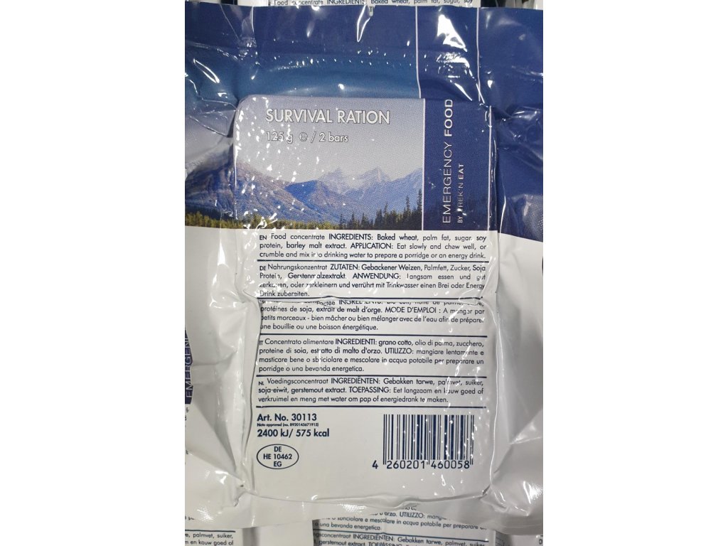 Trek’n Eat Survival Ration – núdzová dávka potravy s trvanlivosťou 20 rokov je kompaktné a vysoko výživné riešenie, ktoré poskytuje okamžitú energiu v akýchkoľvek podmienkach. Ide o MRE (meal-ready-to-eat) potravinu, ktorá je pripravená na konzumáciu priamo z balenia bez potreby varenia alebo ohrievania.